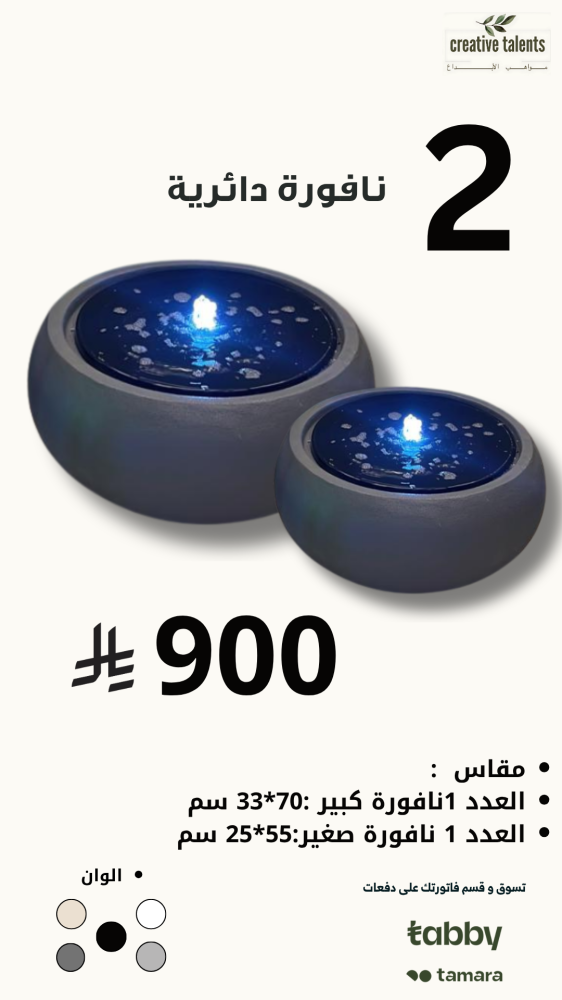 باقة نافورة دائريالمقاس الكبير:70*33سمالمقاس الصغير :55*25 سمملاحظة: مدة التوصيل من 3 ايام الى 4 ايام
